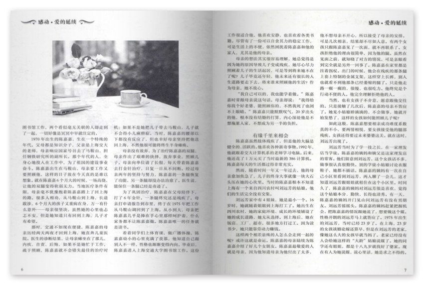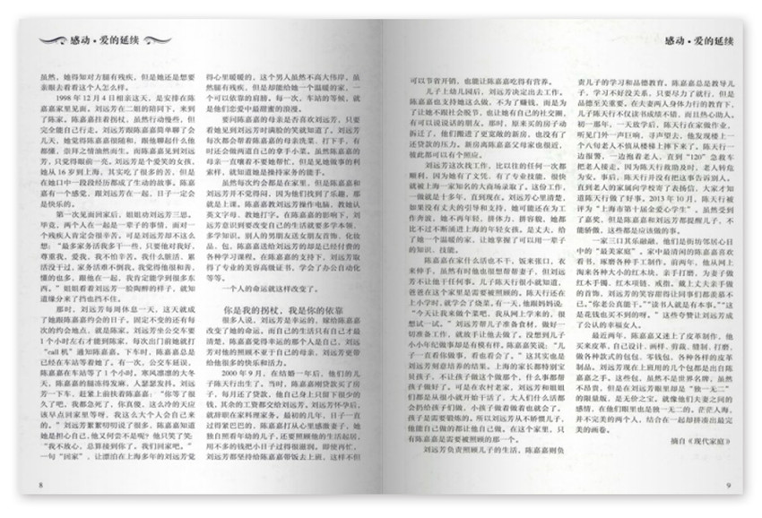 你是我的拐杖,我是你的依靠,很多人說,劉遠芳是幸運的,嫁給陳嘉嘉改變了她的命運。而自己的生活只有自己才清楚,陳嘉嘉覺得幸運的那個人是自己,劉遠芳對他的照顧不亞于自己的母親,劉遠芳更帶給他很多的快樂和活力。2000年9月,在結(jié)婚一年后,他們的兒子陳天行出生了。當時,陳嘉嘉剛貸款買了房子,每月還了貸款,他自己身上只留下很少的錢,其余的工資都交給劉遠芳。