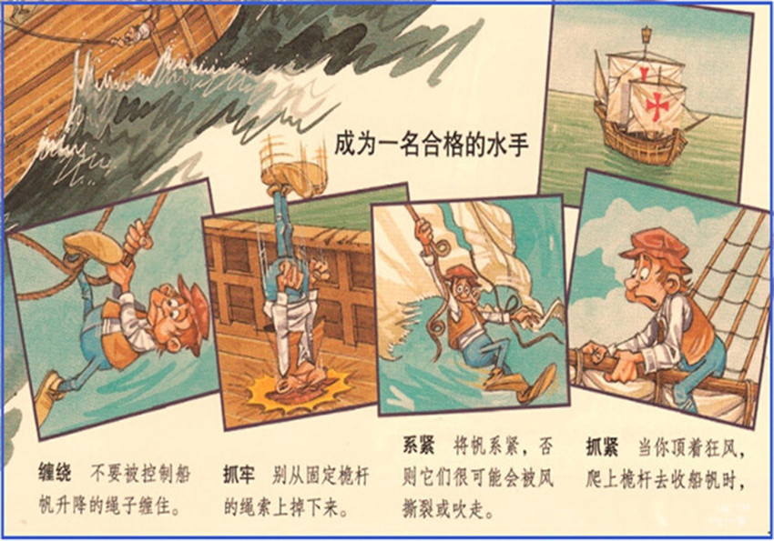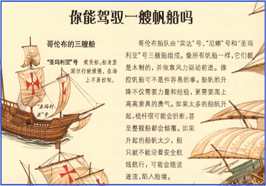 哥倫布船隊(duì)由“賓達(dá)"號(hào)、"尼娜"號(hào)和“圣瑪利亞"號(hào)三艘船組成。像所有帆船一樣,它們都是木制的,并依靠風(fēng)力驅(qū)動(dòng)前進(jìn)。操控帆船可不是件容易的事。船帆的升降不僅需要力量和經(jīng)驗(yàn),更需要爬上高高索具的勇氣。