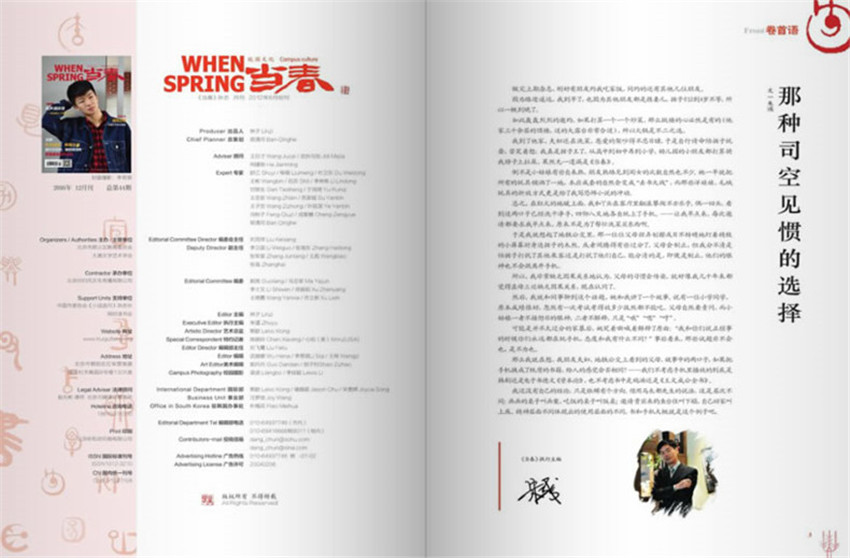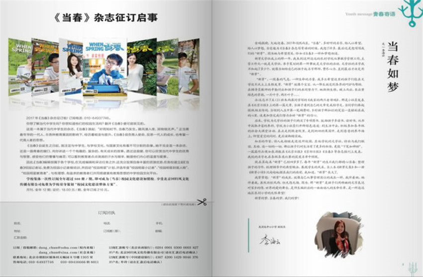 《當(dāng)春》雜志是全國(guó)面對(duì)我國(guó)中學(xué)及中學(xué)生、有國(guó)家正規(guī)刊號(hào)且充分展現(xiàn)中學(xué)校園文化生活的月刊,是由北京順義區(qū)教委與北京回歸風(fēng)文化傳播有限公司聯(lián)合出品,由北京回歸風(fēng)期刊運(yùn)營(yíng)部承擔(dān)策劃、編輯、排版、裝幀設(shè)計(jì)、宣傳發(fā)行