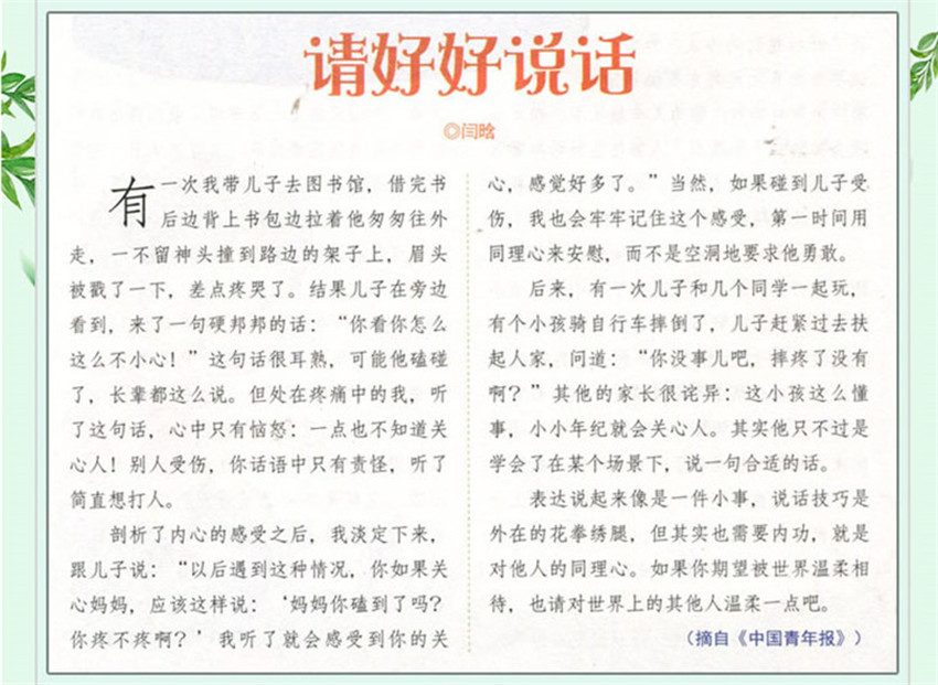 動(dòng)物牙齒趣聞,有后邊背上書包邊拉著他匆匆往外走,一不留神頭撞到路邊的架子上,眉頭被戳了一下,差點(diǎn)疼哭了。結(jié)果兒子在旁邊看到,來(lái)了一句硬邦邦的話:“你看你怎 么這么不小心!”這句話很耳熟,可能他磕碰了,長(zhǎng)輩都這么說(shuō)。但處在疼痛中的我,聽了這句話,心中只有惱怒:一點(diǎn)也不知道關(guān)心人!別人受傷,你話語(yǔ)中只有責(zé)怪,聽了簡(jiǎn)直想打人。