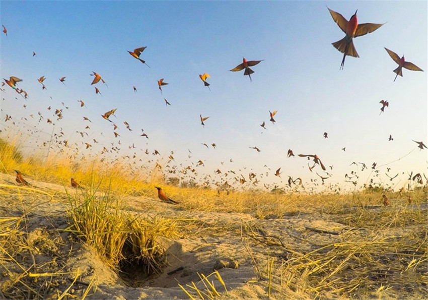 在納米比亞的贊比西河,無以計數的深紅色的食蜂鳥(南紅蜂虎)沖上藍天。你來掌鏡攝影師JasonBoswell說:“”當時一組人正想為幾百只食蜂鳥做標記,以了解它們離開這片土壤后去了哪里。為了躲避人群,鳥兒紛紛起飛,所以才有了這一幕?!苯裉焓敲绹鴩覑埒B節(jié),這個節(jié)日正好碰上一個由市民為了觀察統(tǒng)計國內鳥類健康狀況而發(fā)起的項目——圣誕節(jié)鳥類數量統(tǒng)計。