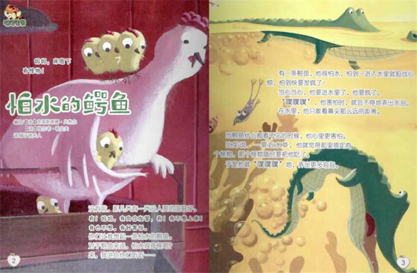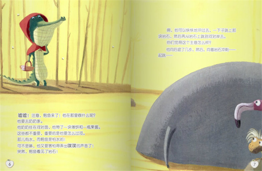 噓噓!注意,鱷魚(yú)來(lái)了!他在那里做什么呢?他要去奶奶家,他奶奶住在河對(duì)面,他帶了一塊薄餅和一瓶果醬。這些都不重要,重要的是他要怎么過(guò)河。那兒有水,而鱷魚(yú)是怕水的!可不是嘛,他又要害怕得弄出噗噗的聲音了!突然,鱷魚(yú)看見(jiàn)了巖石!