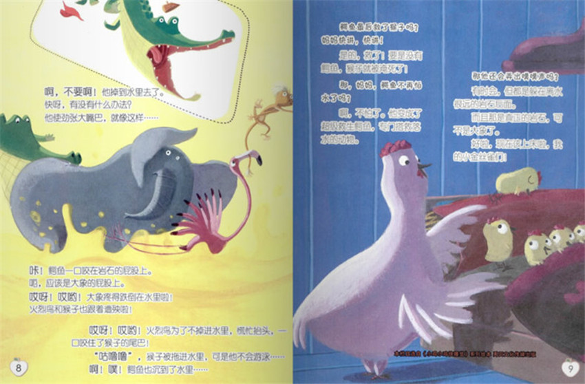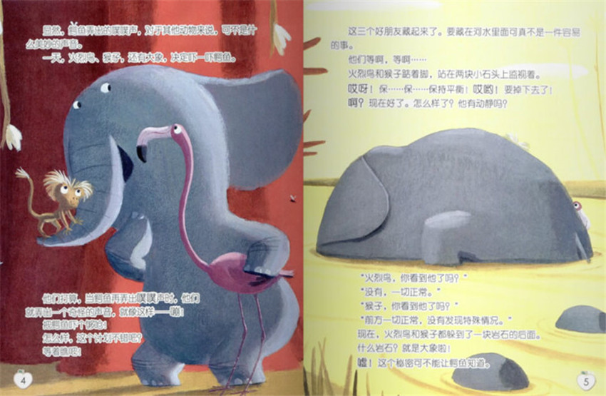 咔!鱷魚(yú)一口咬在巖石的屁股上。呃,應(yīng)該是大象的屁股上。哎呀!哎喲!大象疼得跌倒在水里啦!火烈鳥(niǎo)和猴子也跟著遭殃啦!哎呀!哎喲!火烈鳥(niǎo)為了不掉進(jìn)水里,慌忙抬頭,一口咬住了猴子的尾巴!“咕嚕?!?,猴子被拖進(jìn)水里,可是他不會(huì)游泳...啊!噗!鱷魚(yú)也沉到了水里....