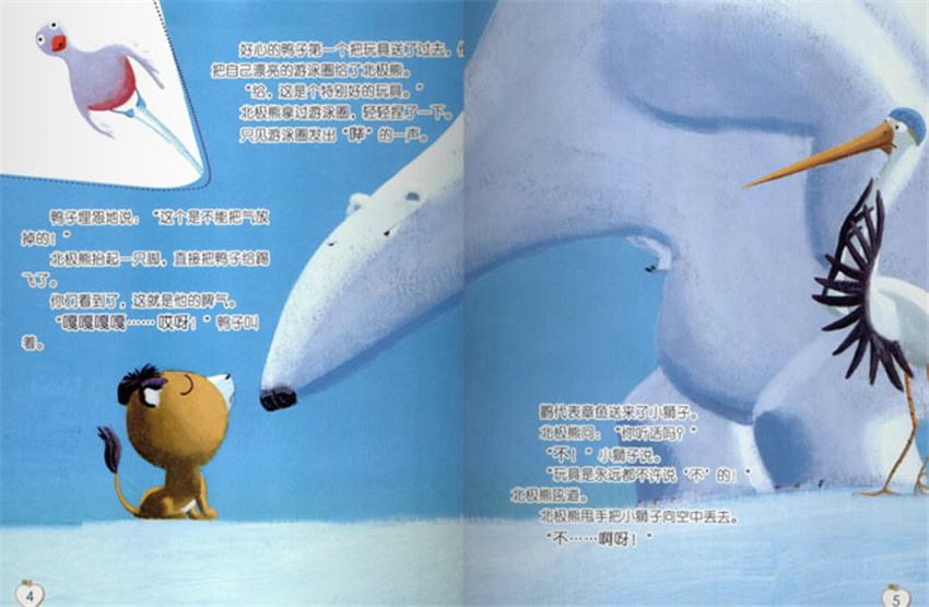 好心的鴨子及時(shí)一個(gè)把玩具送了過(guò)去,把自己漂亮的游泳圈給了北極熊,“給,這是個(gè)特別好的玩具,北極熊拿過(guò)游泳圈,輕輕捏了一下。只見(jiàn)游泳圈發(fā)出“嗶”的聲。鴨子埋怨地說(shuō):“這個(gè)是不能把氣放掉的,北極熊抬起一只腳,直接把鴨子給踢飛了,你們看到了。這就是他的脾氣。“嘎嘎嘎嘎..哎呀1”鴨子叫著。