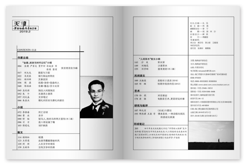 《天涯》雜志創(chuàng)辦于1972年,注重理論聯(lián)系實(shí)際,創(chuàng)刊多年來得到了長足發(fā)展,雜志內(nèi)容充實(shí)、版式清新,裝幀精美,深受廣大讀者好評?!短煅摹芬缘懒x感、人民性、創(chuàng)造力定位,追蹤當(dāng)下的思想文化動態(tài),努力切入時代的文化心理深處,承擔(dān)起精神解放和文化建設(shè)的使命,拒絕與低俗為伍。