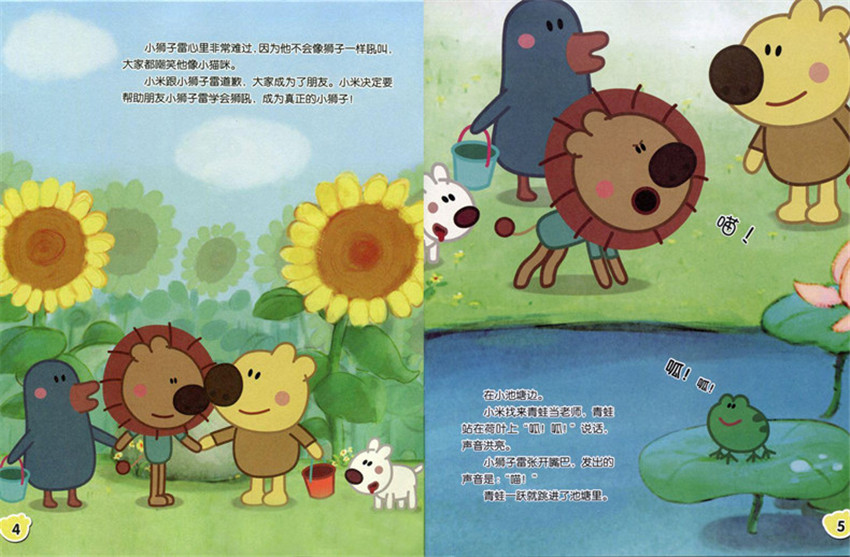 小獅子雷心里非常難過因為他不會像獅子- -樣吼叫,大家都嘲笑他像小貓咪。小米跟小獅子雷道歉,大家成為了朋友。小米決定要幫助朋友小獅子雷學會獅吼,成為真正的小獅子!在小池塘邊,小來找來青蛙當老師,青蛙站在荷葉上呱呱的說話,聲音洪亮。小獅子雷張開嘴巴。發(fā)出的聲音是:喵,青蛙一躍就跳進場池塘里。