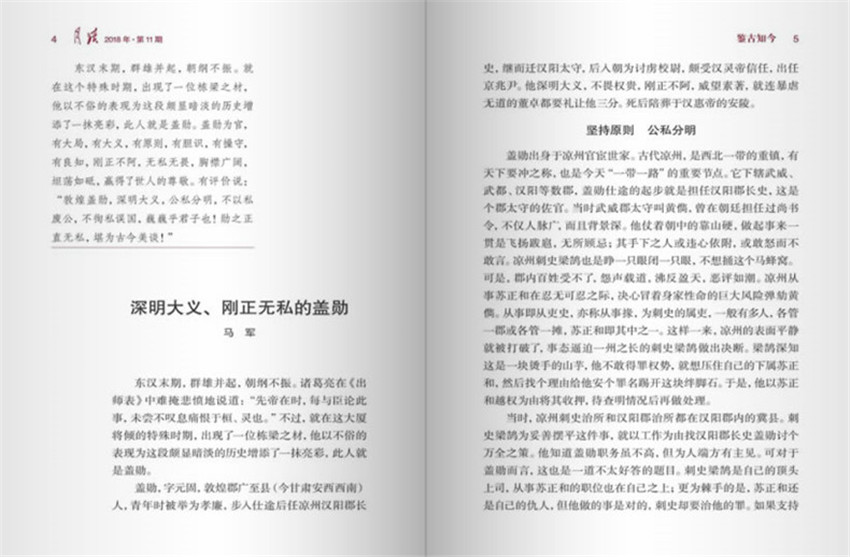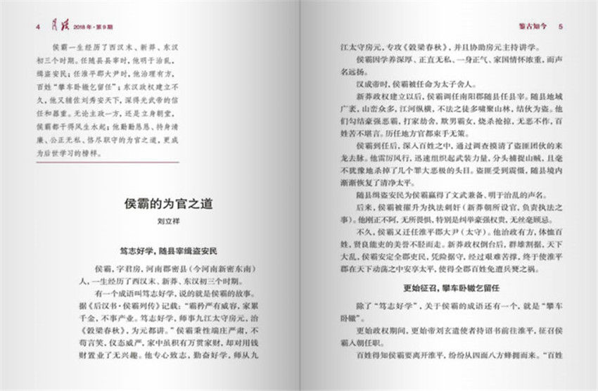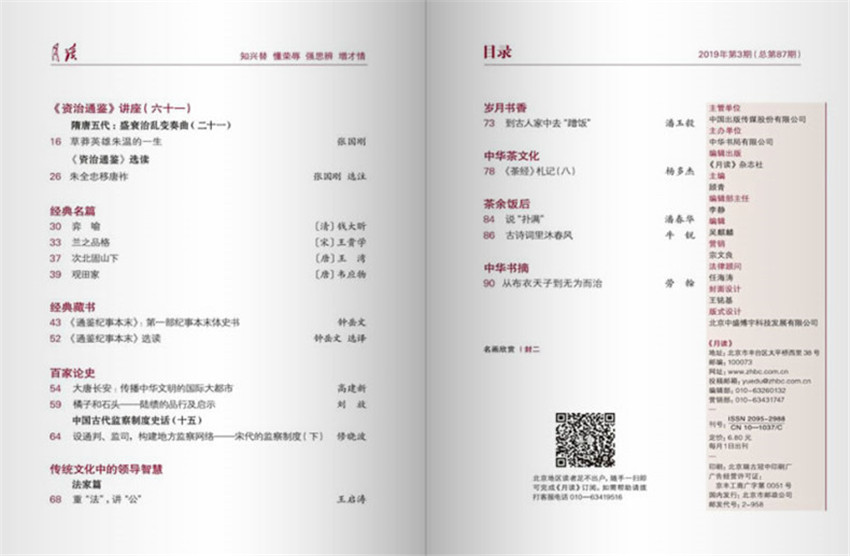 《月讀》雜志創(chuàng)辦于2012年,注重理論聯(lián)系實(shí)際,創(chuàng)刊多年來(lái)得到了長(zhǎng)足發(fā)展,雜志內(nèi)容充實(shí)、版式清新,裝幀精美,深受廣大讀者好評(píng)。由古代史事,探索對(duì)當(dāng)今的啟示和借鑒,關(guān)于中國(guó)傳統(tǒng)思想精華的系列文章,如“天下為公”“厚德載物”等,社會(huì)主義核心價(jià)值觀經(jīng)典名句,易讀易摘易記,特邀清華大學(xué)張國(guó)剛教授開設(shè)講座,與讀者一起品讀這部史學(xué)名著。